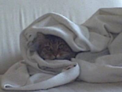 Voici une petite photo de la chattounette qui squatte, Onyxia, emitoufflée dans un plaid bien chaud =D